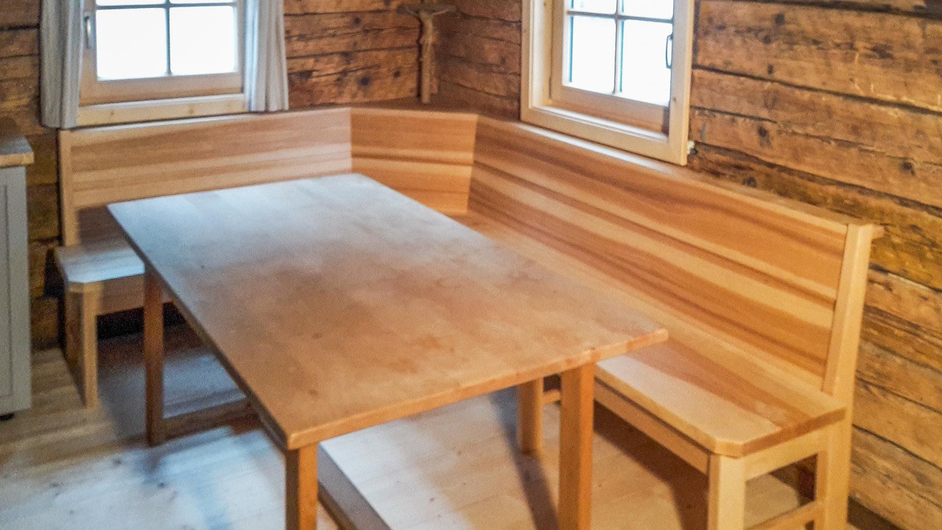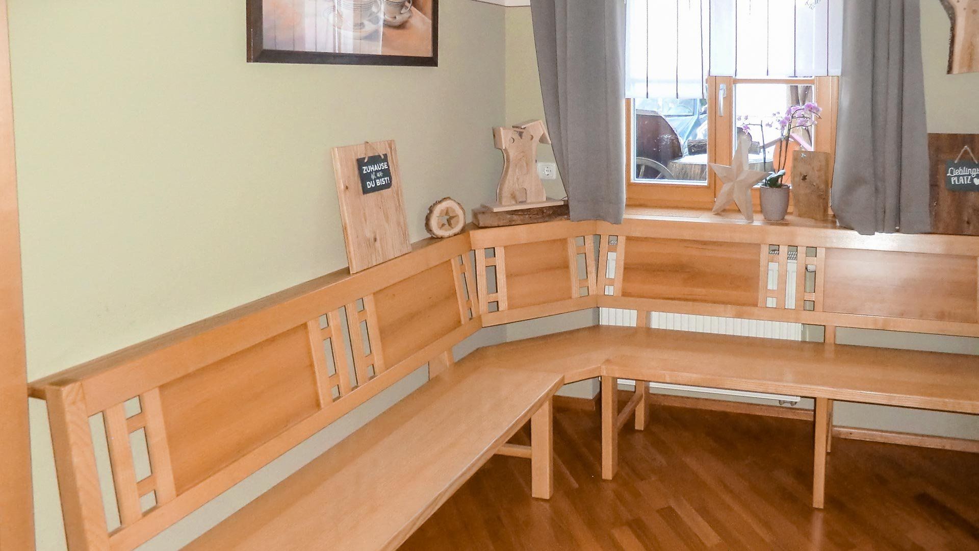 Hier ist ein Projekt, wo wir eine gemütliche Eckbank aus Esche mit Füllungen aus Elsbeere entwerfen durften.