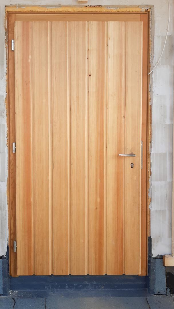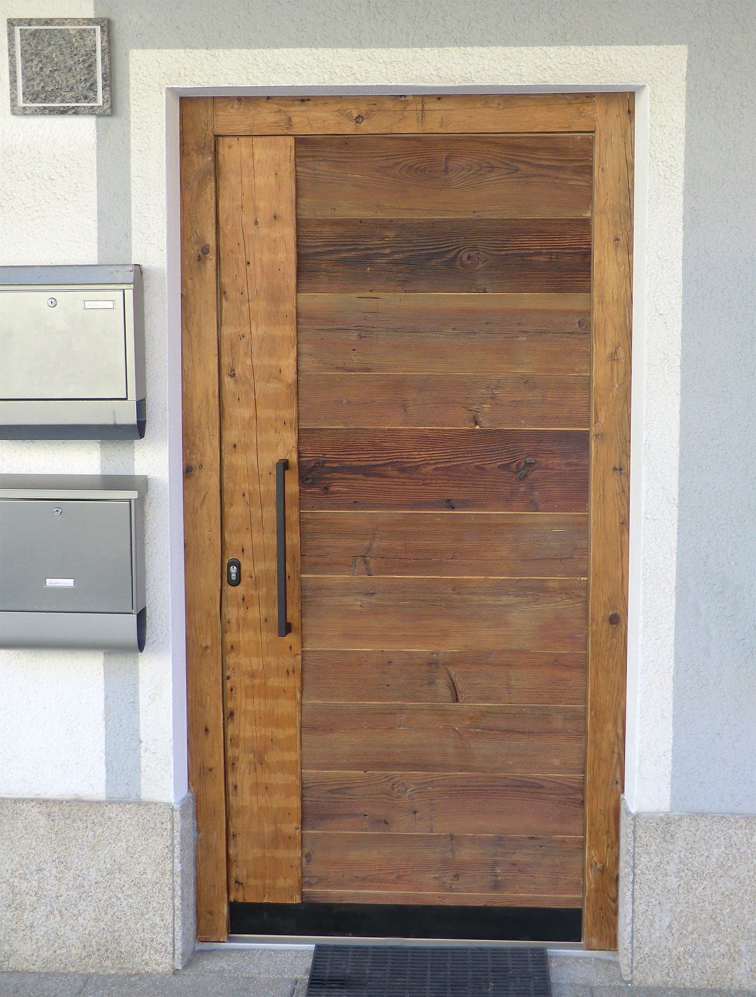 Eine Eingangstüre mit Brettcharakter, in Lärche.