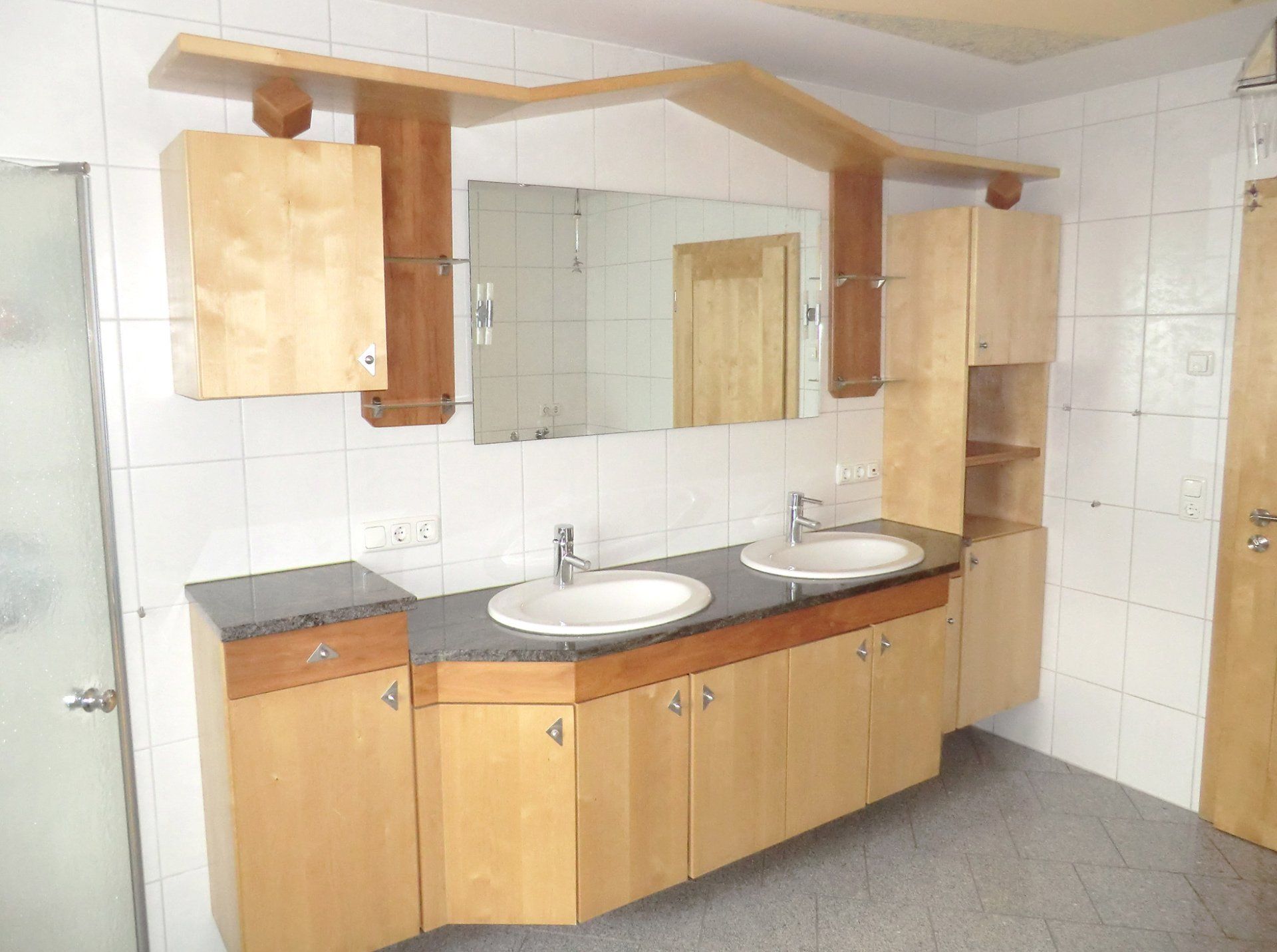 Geräumige Badezimmerwand aus Birke und Zwetschge lackiert, mit Glasablagefächern und Marmorplatte Abschlussbrett gehalten mit Holzwürfeln aus Zwetschgenbaumholz, dazu passend: Deckenbeleuchtung und Zimmertüre