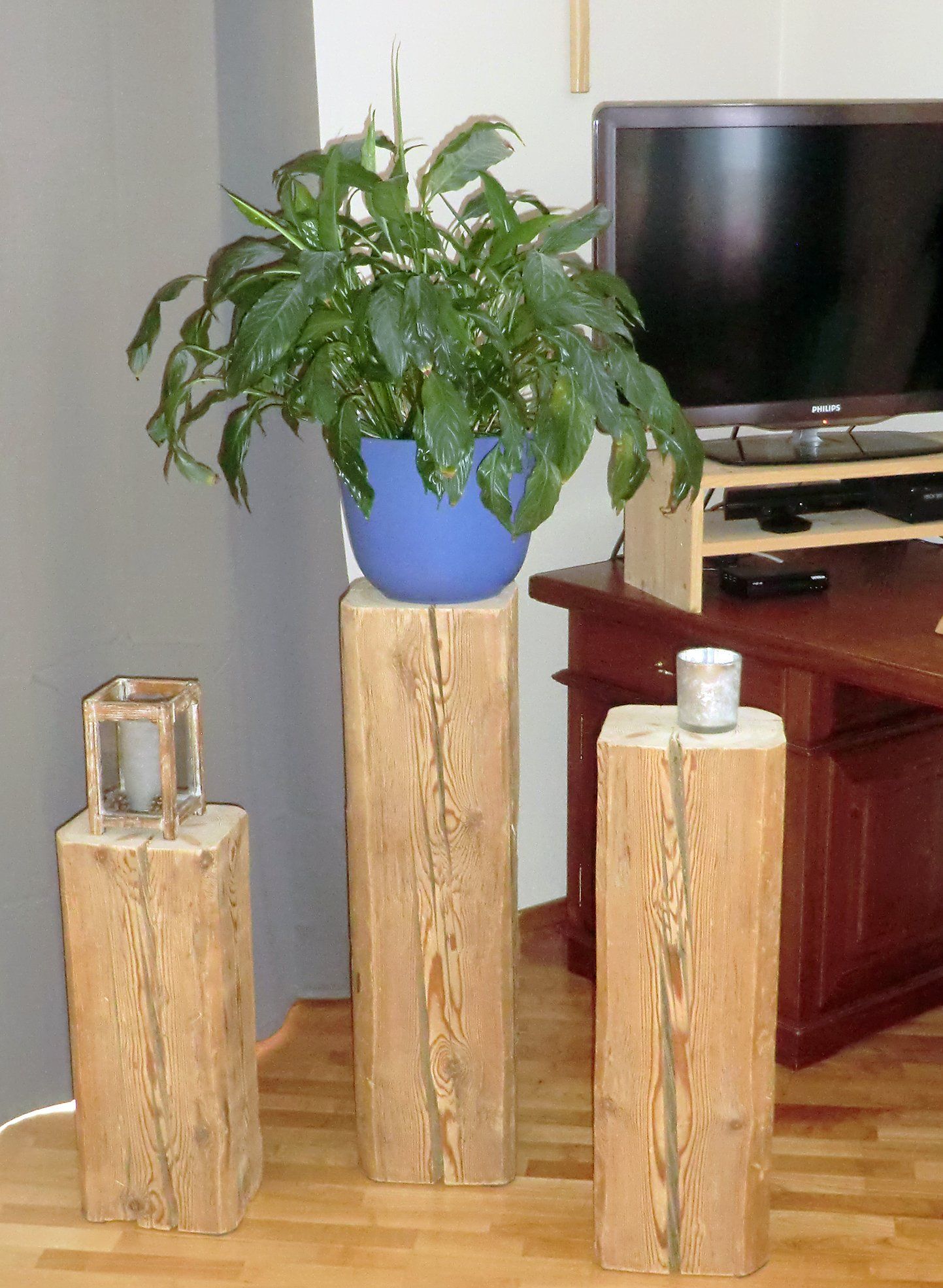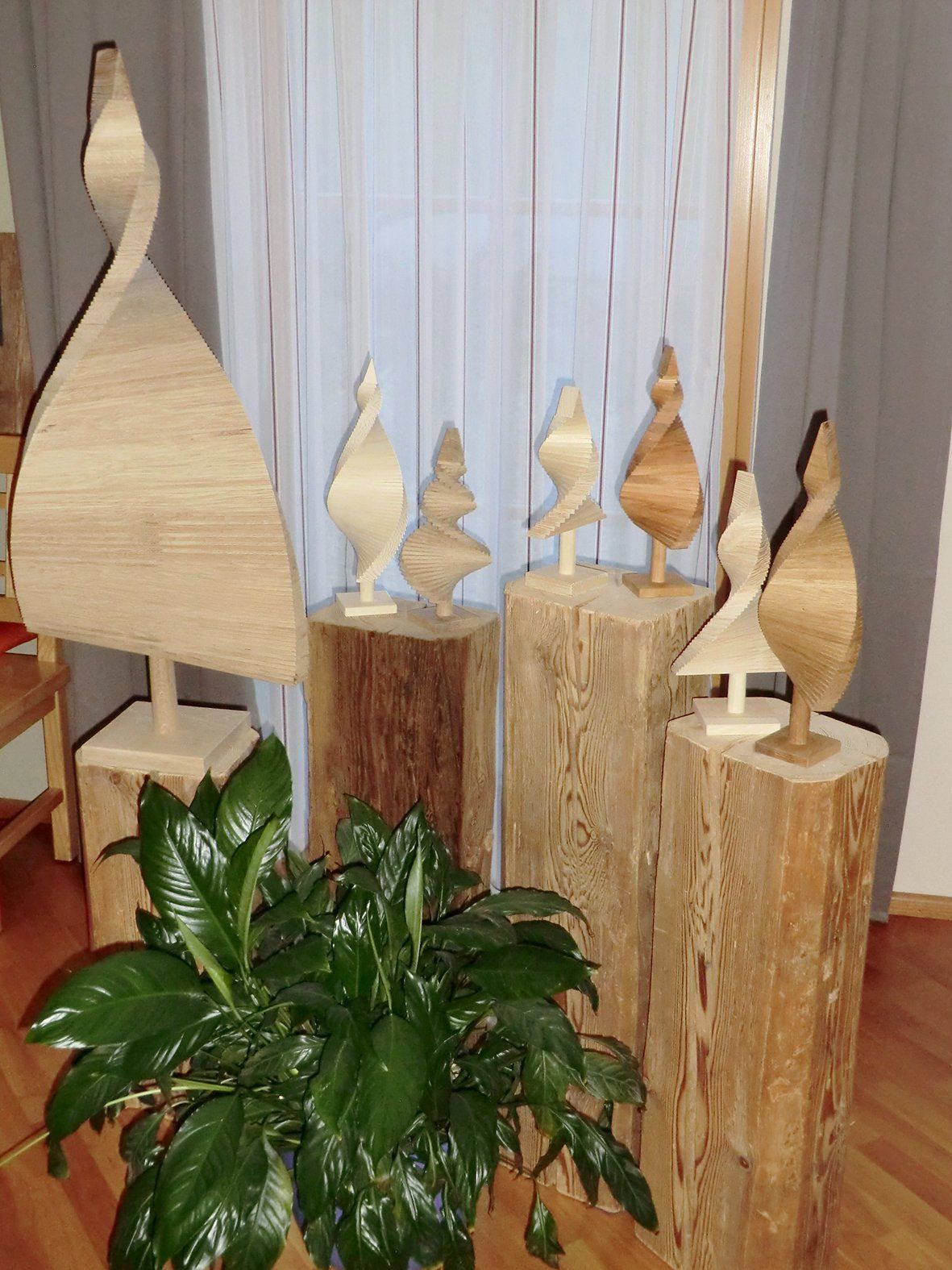 Lattenbäume aus verschiedenen Massivhölzern und Größen, Oberfläche unbehandelt.