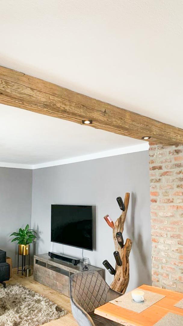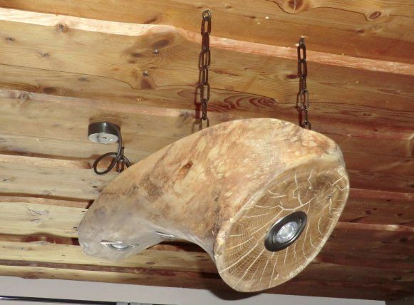 Hier entstand eine Deckenleuchte aus einem alten Holzbalken mit integrierten LED-Einbaustrahlern.