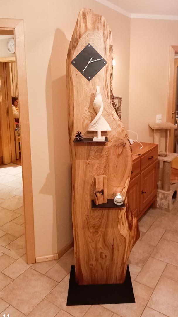 Verschiedene Kleinmöbel Originelle Uhr aus Eichen-Astbrett mit Baumrinde - Pendelleuchte aus Eiche (Astholz), Mittelteil passend zur Wohnzimmereinrichtung gebeizt, mit indirekter LED-Beleuchtung - Pinnwände aus alten Kirschbaumbrettern, geölt, Hoch- und Querformat für Büro und privat - Dekoobjekte aus alten Balken, gebürstet.