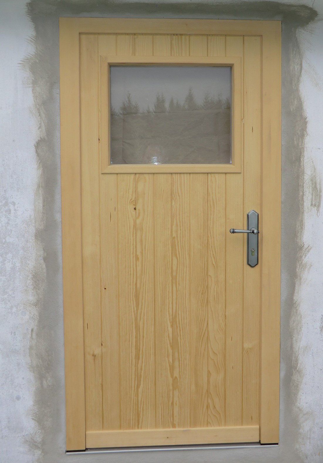 Haustüre mit Sternaufdopplung, Eiche massiv. / Nebeneingangstüre in Fichte, mit senkrechter Aufdopplung und Glasausschnitt