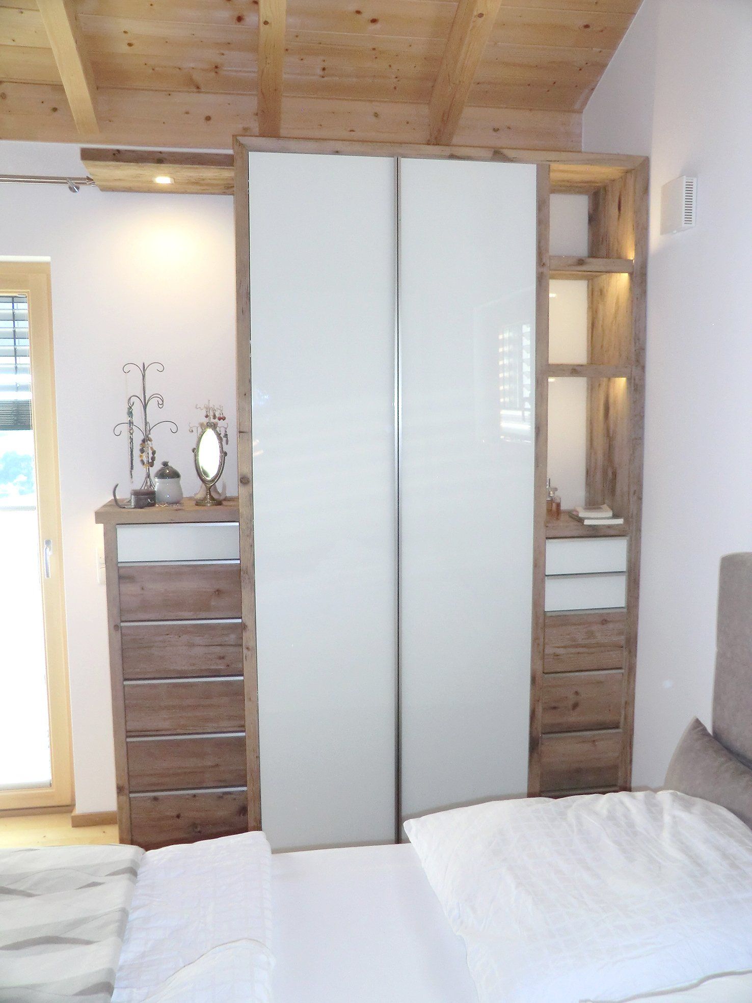 Schränke aus Fichte-Altholz mit weiß-lackierten Glastüren und durchgehenden Edelstahl-Griffleisten. Automatische LED-Beleuchtung, schaltet sich beim Öffnen der Türen ein. Schubkasten im Kleiderschrank mit Tip-On-Beschläge. Schubladen in den Kommoden mit Glaseinsätzen für bessere Sicht der Kleidungsstücke.