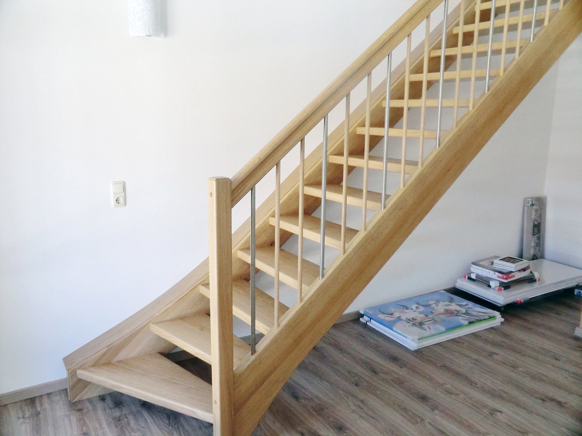 Bild3:gerade Treppe, Stufen in Eiche, Wangen und Geländer in Fichte, mit Edelstahlstäben kombiniert