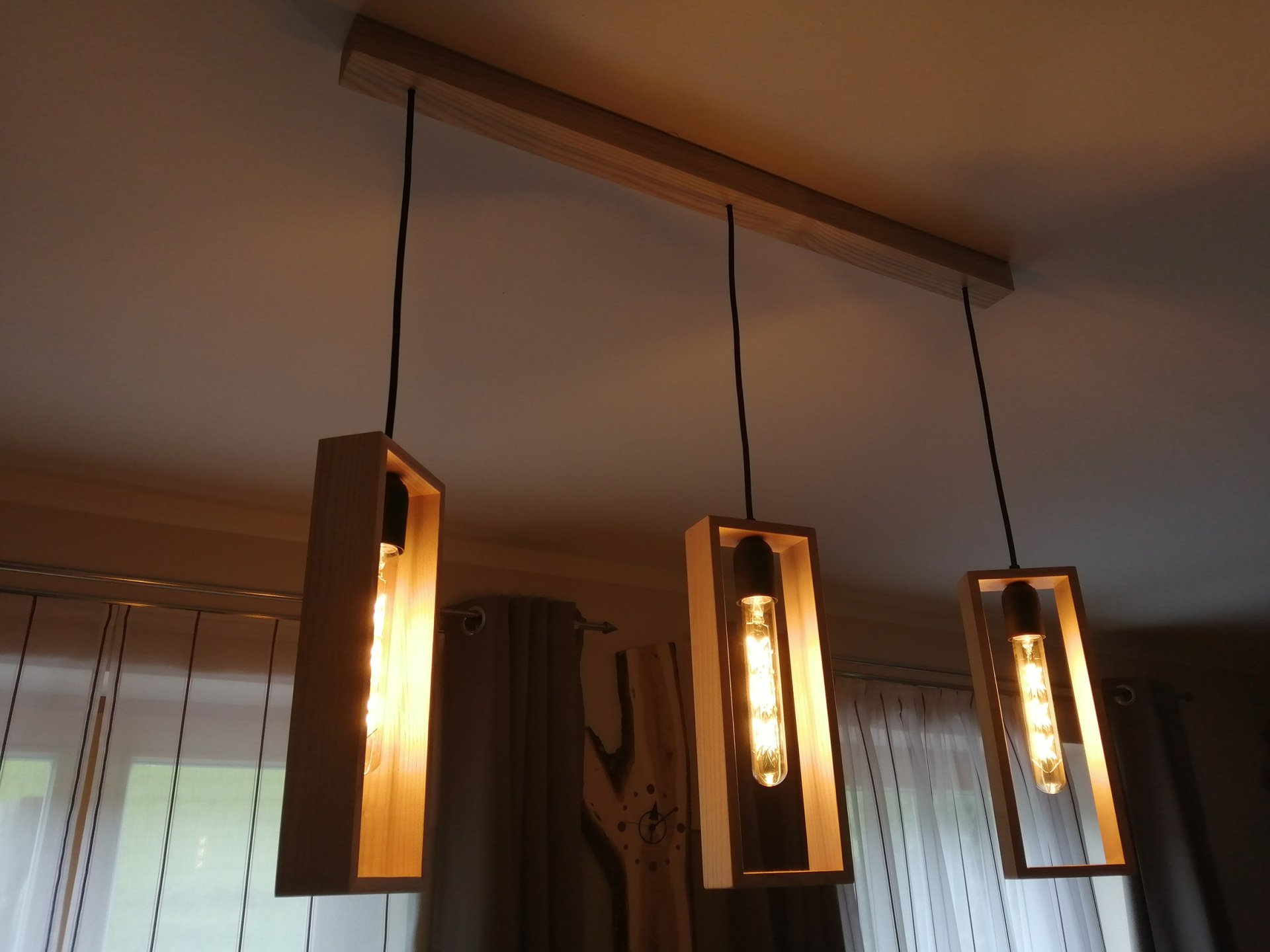 Hängelampe aus Altholzbalken, bewegliche LED, Metallketten