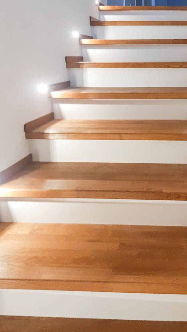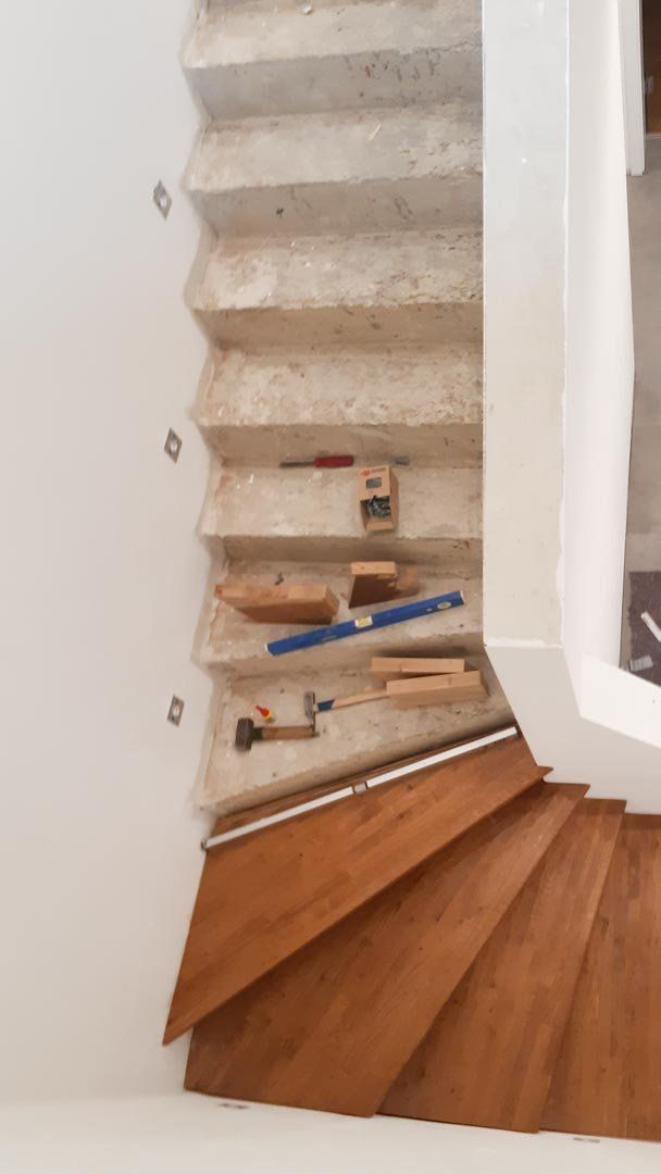 Verkleiden einer Betontreppe im Neubau mit keilgezinkter Eiche, gebeizt und geölt. Die Bilder zeigen den Verlauf während der Montage.