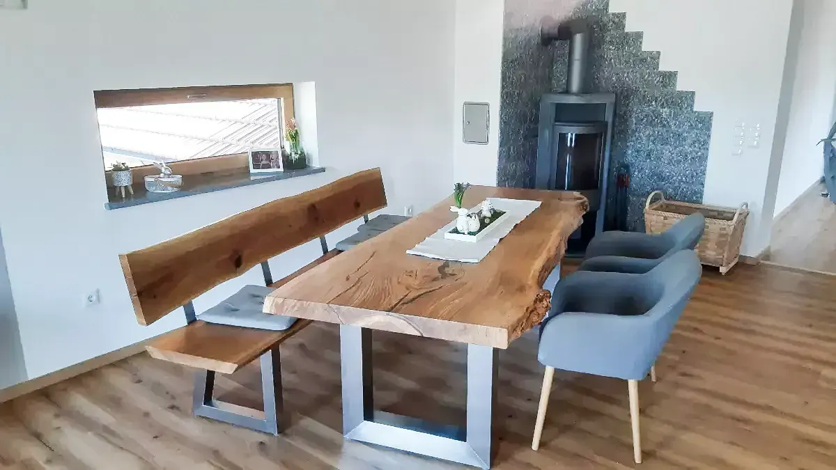 Gemütlicher Esszimmertisch aus Nußbaumholz, kombiniert mit einer urigen Sitzbank. Passend dazu eine Hängelampe aus Altholzbalken mit Metallrohren verbunden.