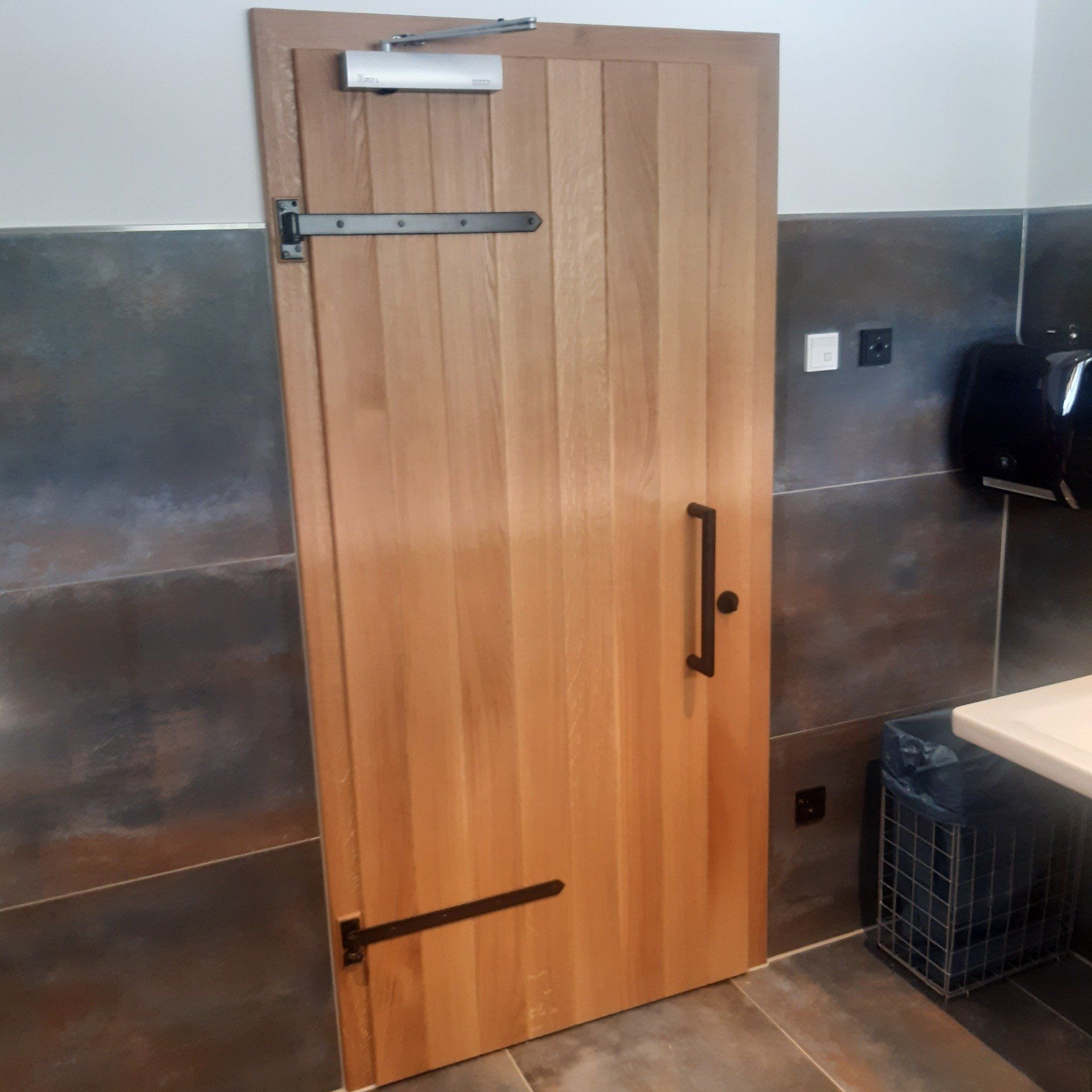 Neue Tür nach altem Muster. Diese Eichentür ist durch ihre Metallschaniere auswergewöhnlich und ist sowohl innen wie außen ein echter Hingucker.