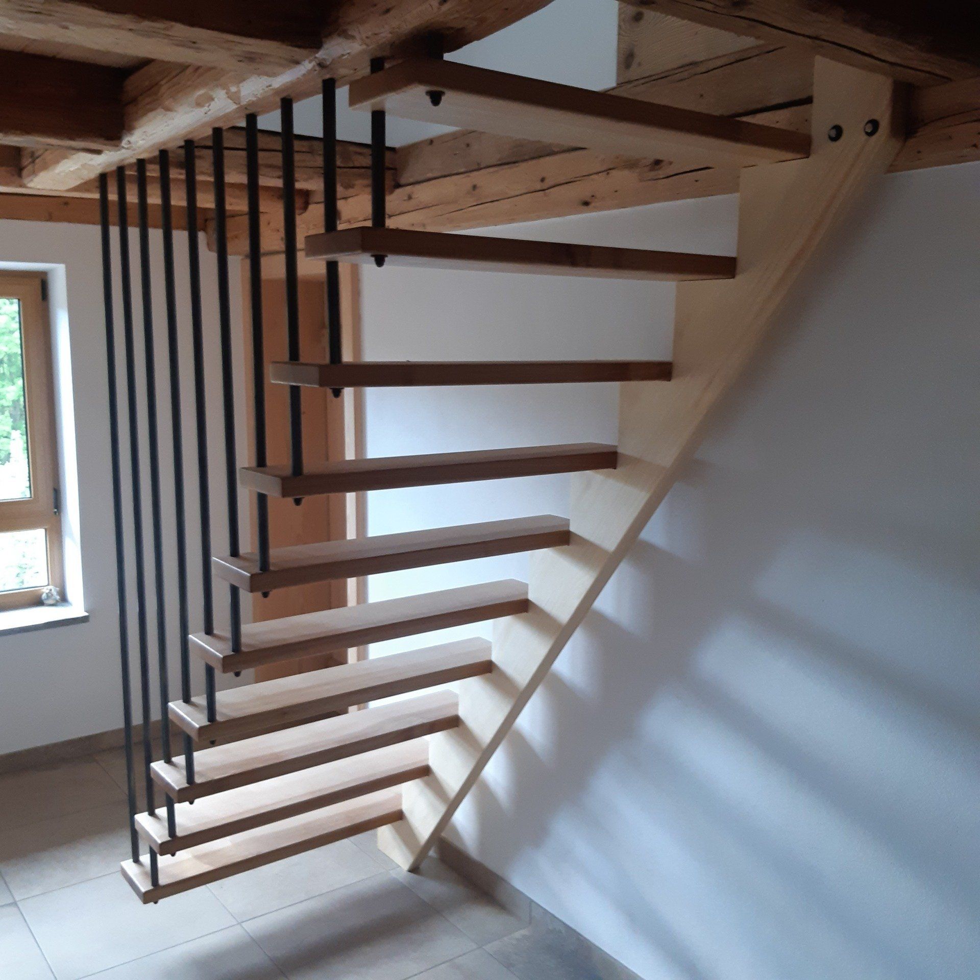 Bild2: halbgewandelte Treppe aus Eiche gebeizt und lackiert, Mauerbefestigung, Geländer aus schwarzen Metallstäben, von Decke abgehängt