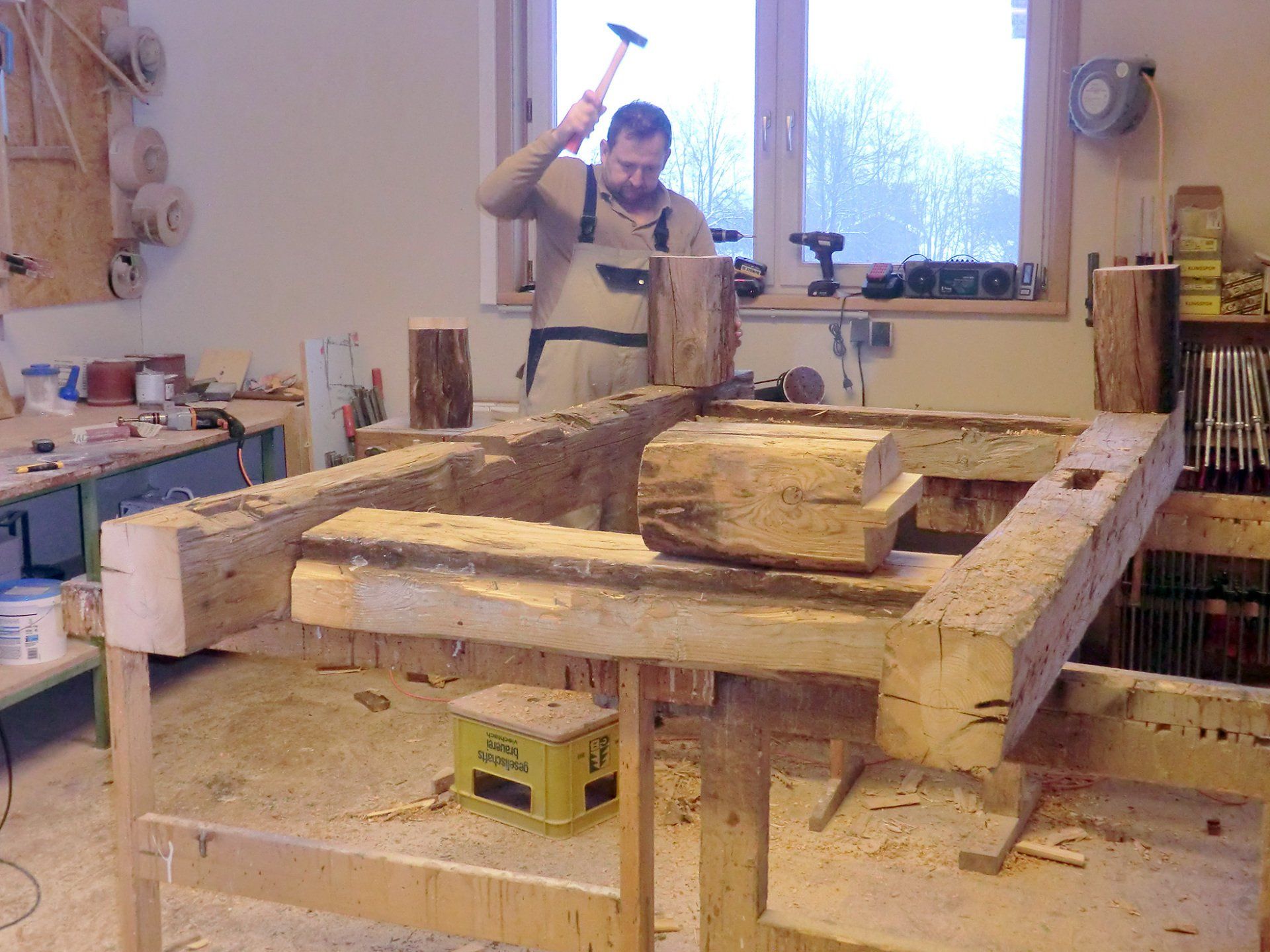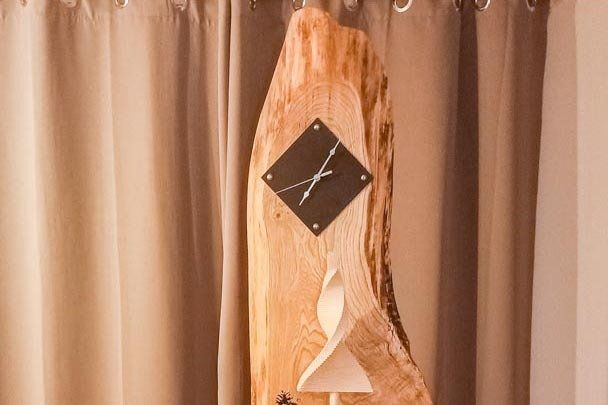 Hier durften wir aus einer urigen Holzbohle eine Standuhr fertigen, diese ist befestigt auf einer schwarzen Metallplatte.