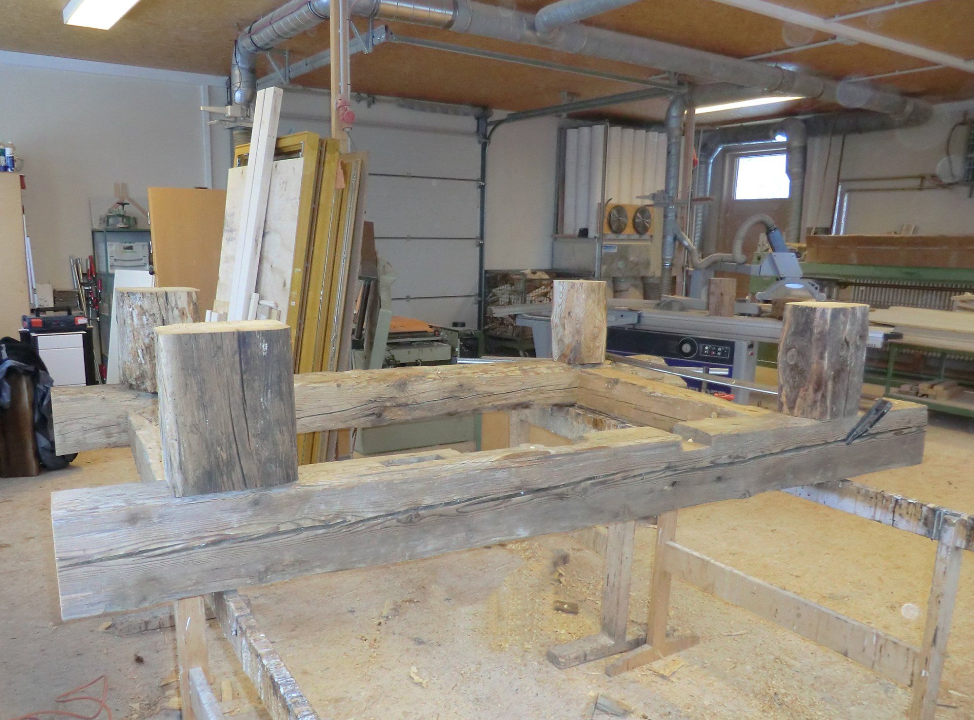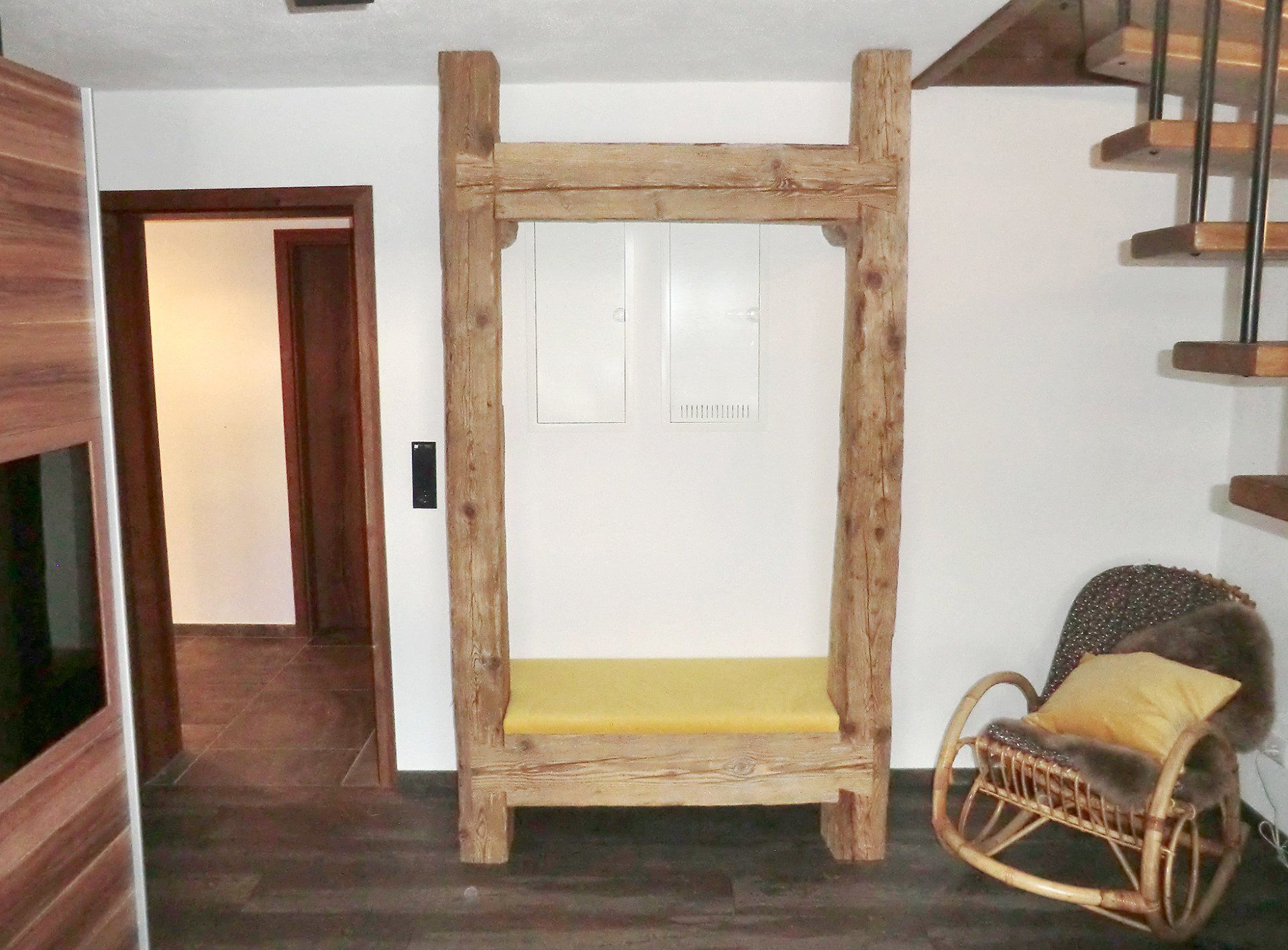 Garderobe aus alten Balken mit gepolsterter Sitzfläche