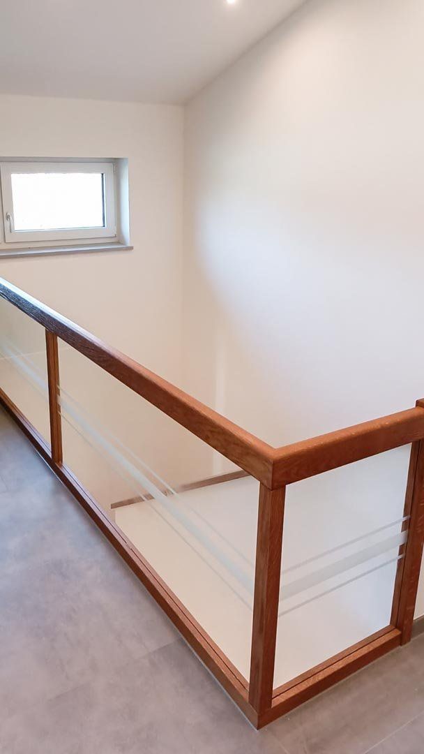 Treppengeländer in Eiche (gebeizt und geölt) mit Verbundsicherheitsglas mit je 3 Streifen sandgestrahlt. Glas und Holz kombinieren sich hervorragend.