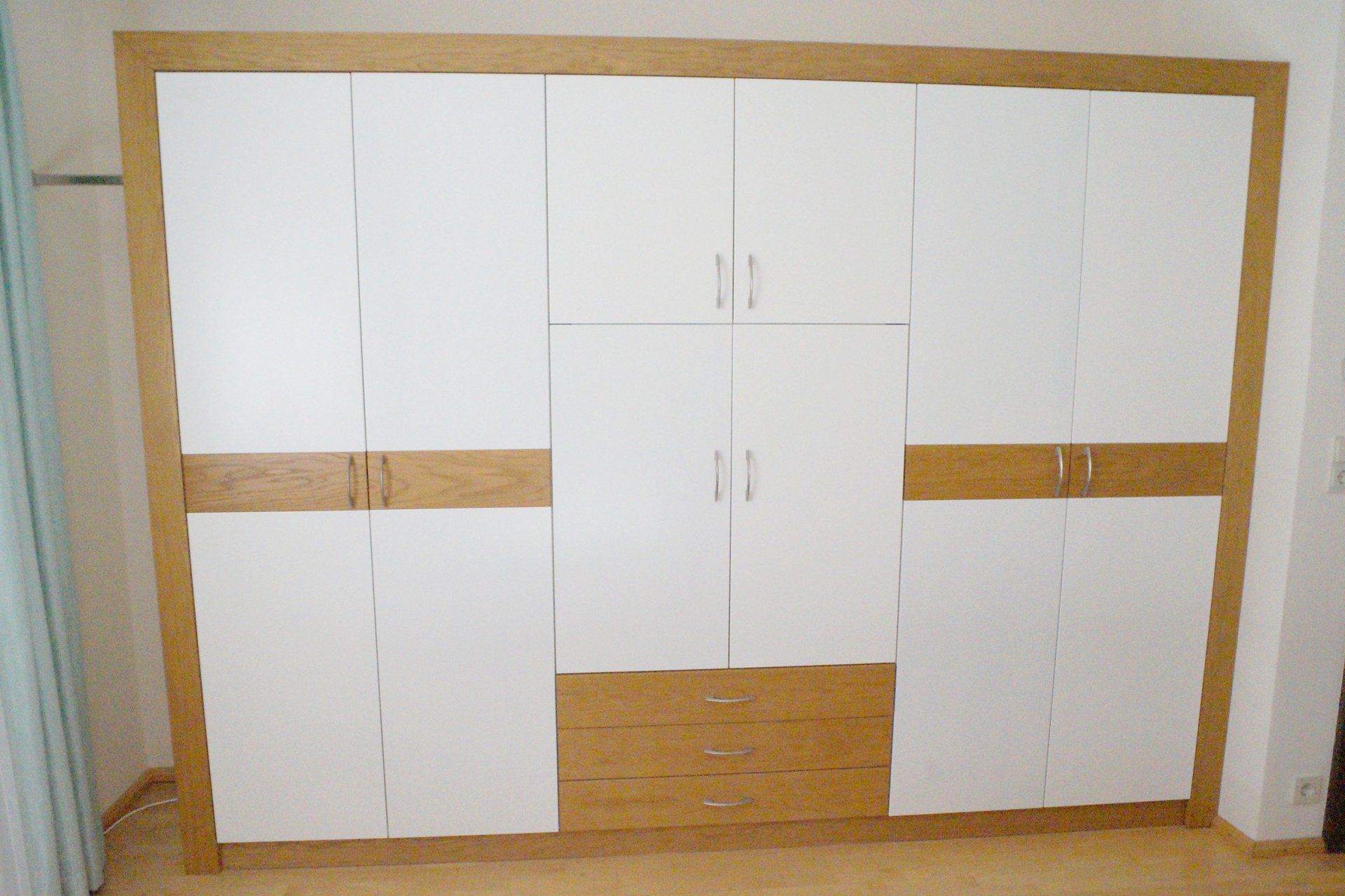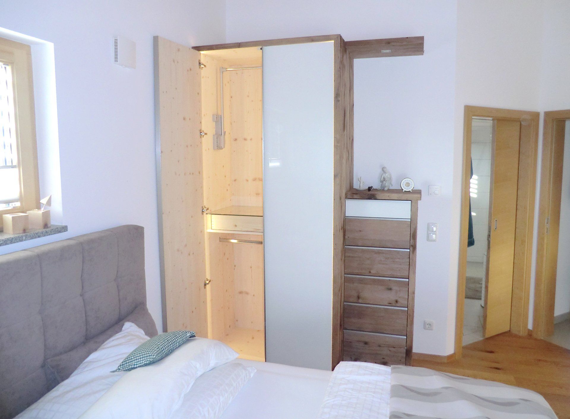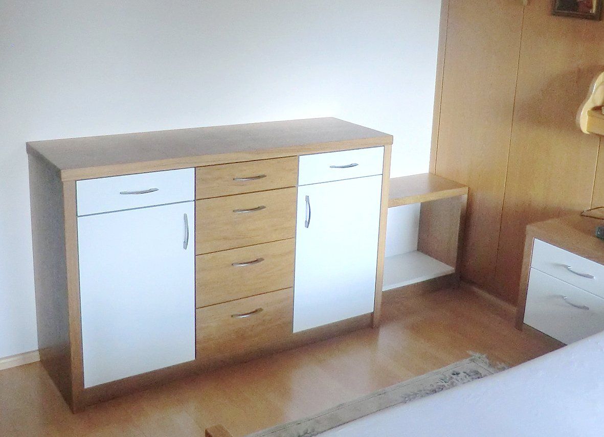 Schlafzimmer aus Eiche, großer Kleiderschrank und Kommode mit weiß-lackierten Türen und in der Mitte mit Schubladen. Die obere Türe ist mit einem Fernseh-Staufach versehen. Türen können beim Öffnen in den Schrank verstaut werden! Doppelbett mit Hänge-Nachtschränkchen, Wandverkleidung und offenen Ablageregalen