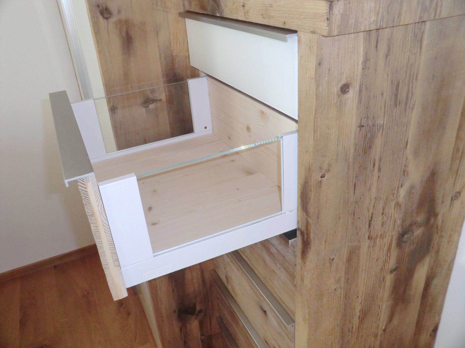 Schränke aus Fichte-Altholz mit weiß-lackierten Glastüren und durchgehenden Edelstahl-Griffleisten. Automatische LED-Beleuchtung, schaltet sich beim Öffnen der Türen ein. Schubkasten im Kleiderschrank mit Tip-On-Beschläge. Schubladen in den Kommoden mit Glaseinsätzen für bessere Sicht der Kleidungsstücke.
