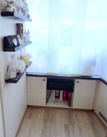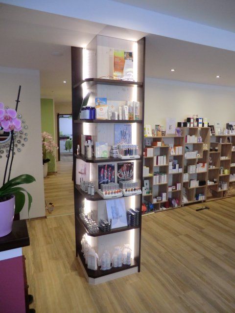 Kompletter Umbau des Kosmetikstudios Sandra. Um attraktive Akzente zu setzen, wählte ich eine Kombination aus hellem und dunkel gebeiztem Fichtenholz. Für eine starke Präsentation der Produkte integrierte ich in die Schausäulenverkleidung zahlreiche Fächer und eine indirekte Beleuchtung mit LED.
