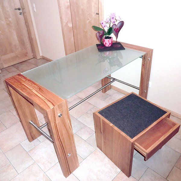 Moderner Schreibtisch in Kirschholz, geölt, mit Edelstahl und Glasplatte. Hocker mit Schublade und Filzauflage.