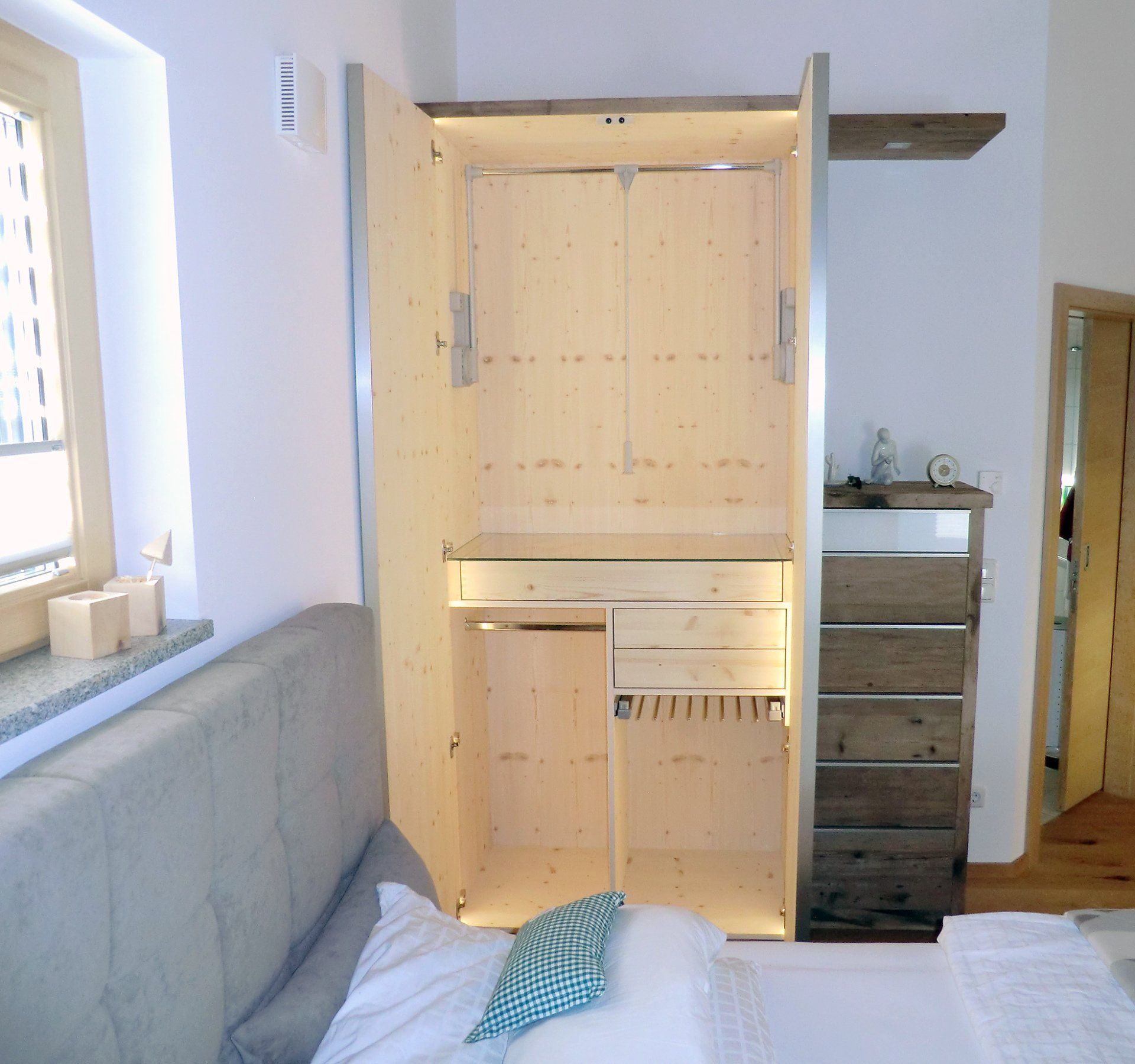 Die Schiebetür ist durch ihre Bauweise nicht nur platzsparend sondern fügt sich durch die Zirben- und Heublumenoptik optimal in das Hotelzimmerdesign ein.