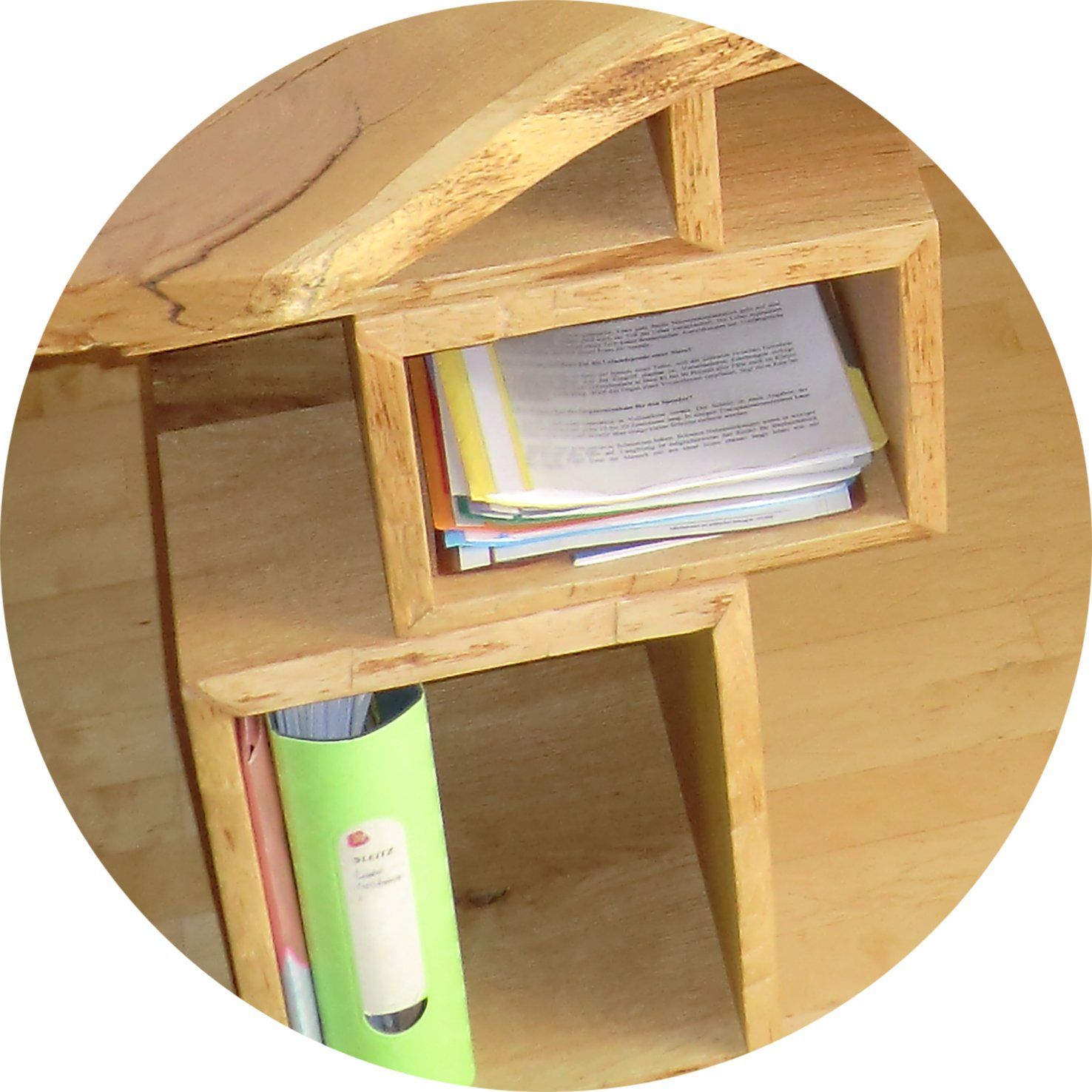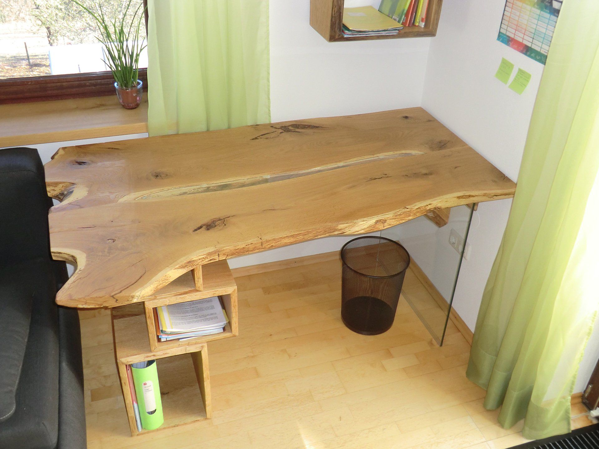 Schreibtisch aus Eiche mit Glasfuß und 4-eckigen Ablagefächern, versetzt montiert, Tischplatte mit schmalem Glaseinsatz Passend dazu: 4-eckige Wandregale