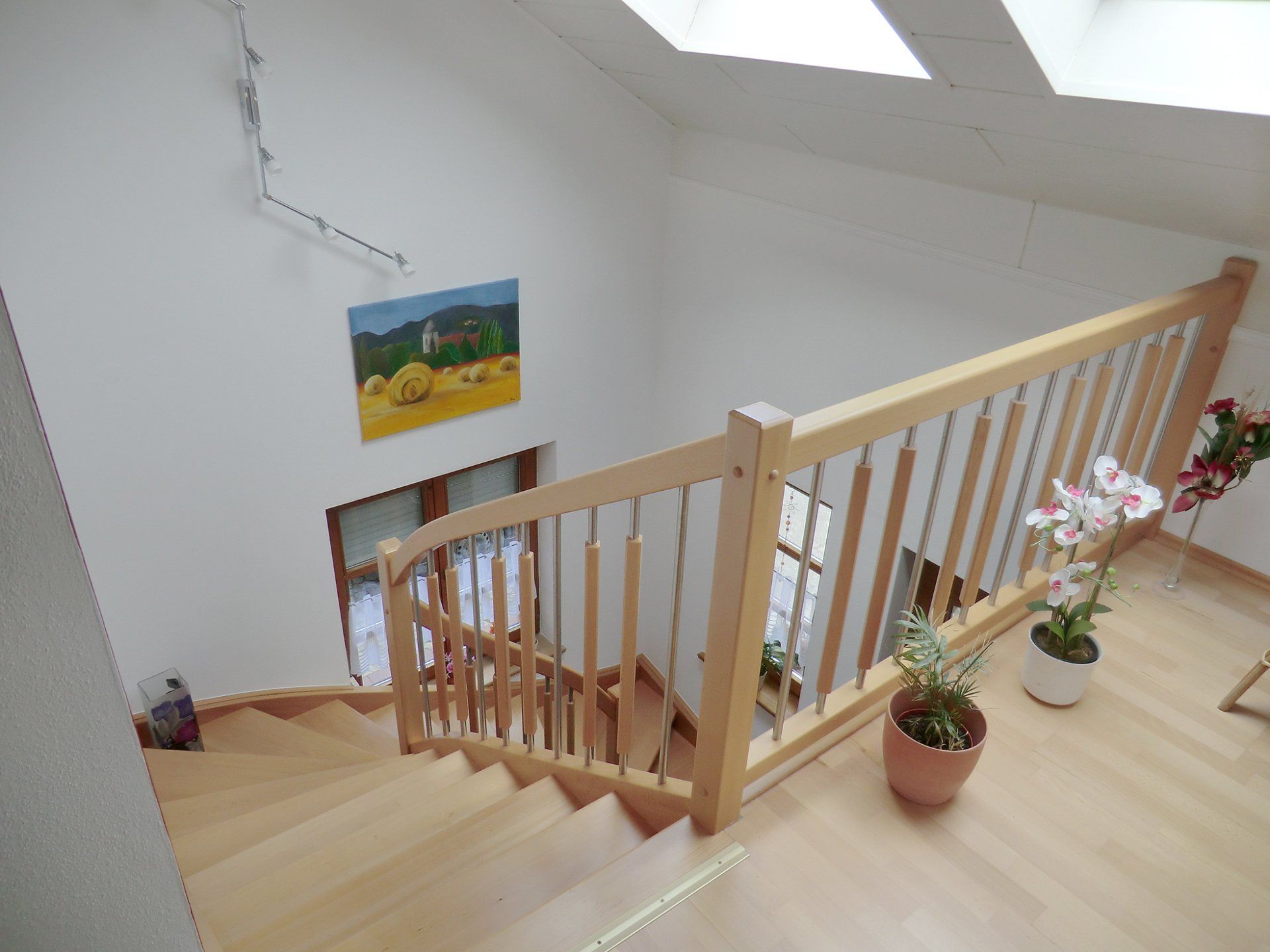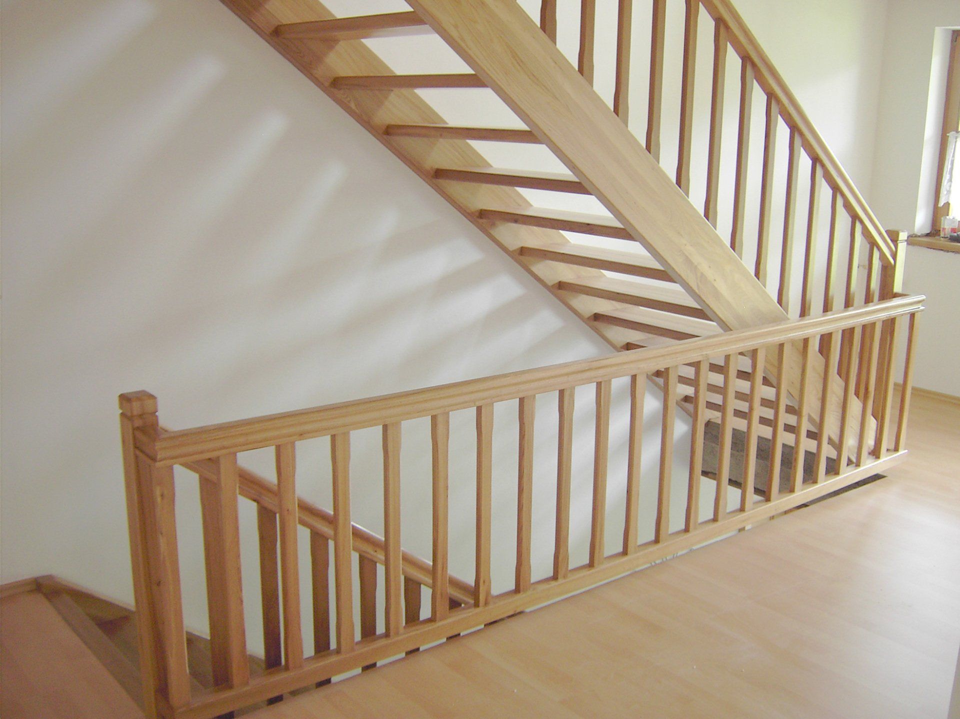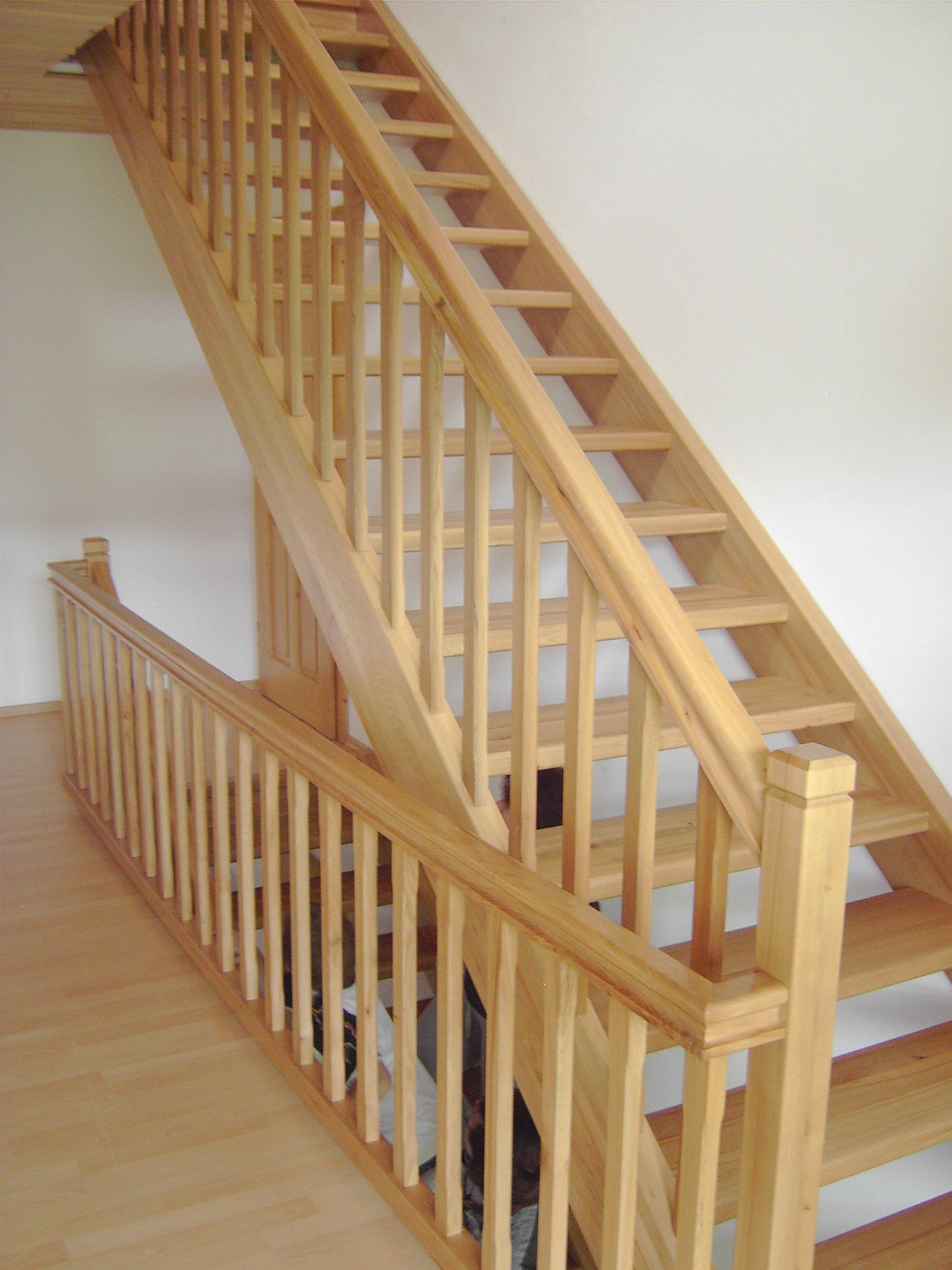 Bild3:gerade Treppe, Stufen in Eiche, Wangen und Geländer in Fichte, mit Edelstahlstäben kombiniert