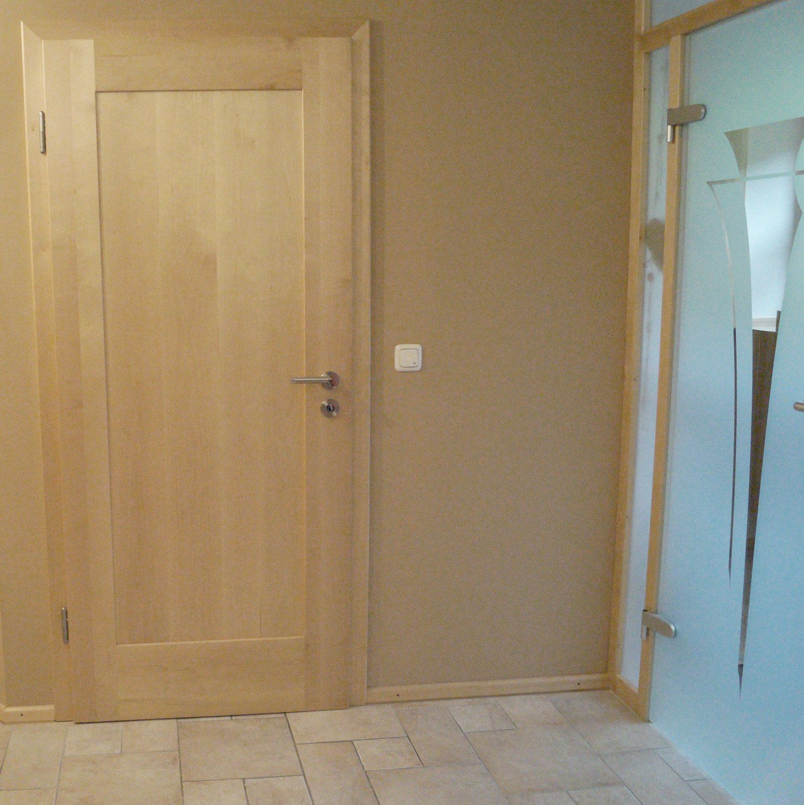 Bild2:Windfangtüre aus Glas, Motiv sandgestrahlt, mit Holzrahmen aus Birkenholz