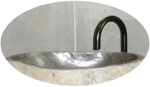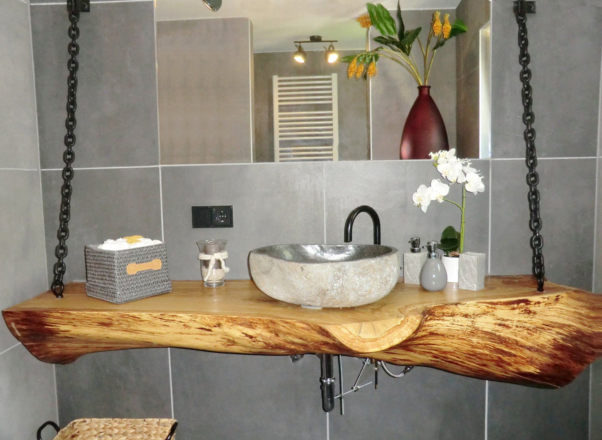 Waschtisch aus Eichenstamm mit Granit-Waschbecken, innen poliert, Besfestigung mit schwarzer Eisenkette