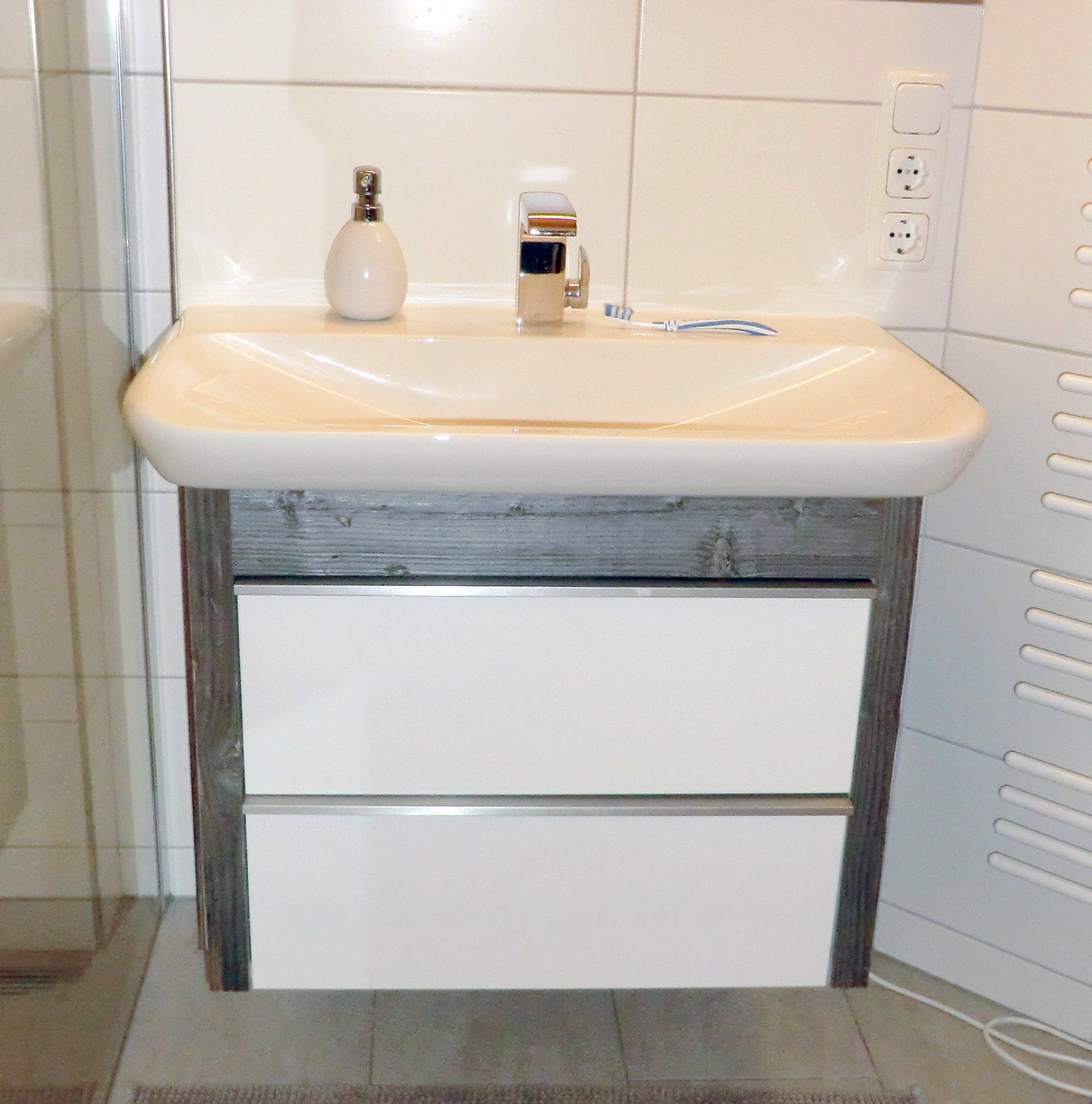 Möbel, auch für kleinste Bäder. Kommode und Waschbeckenunterschrank aus Fichte-Altholz, grau, weißlackierte Türen, Griffe aus Edelstahlleisten