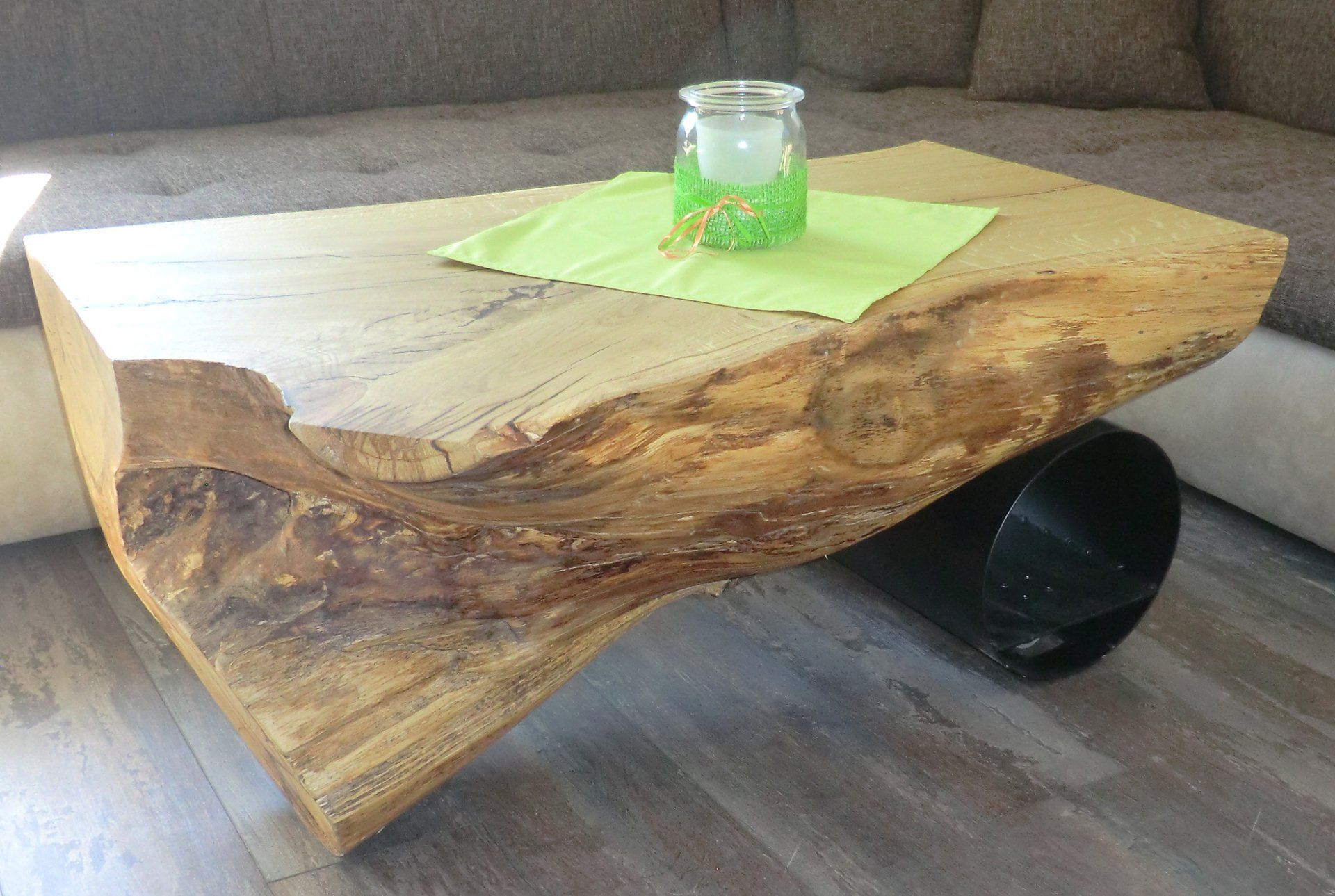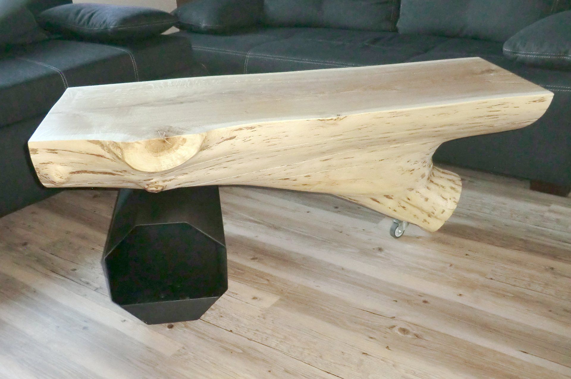 Bild2 bis 3:Wohnzimmertisch aus Eichenstamm, geölt, Standfuß aus 8-eckigem, schwarzen Metallrohr mit Rollen